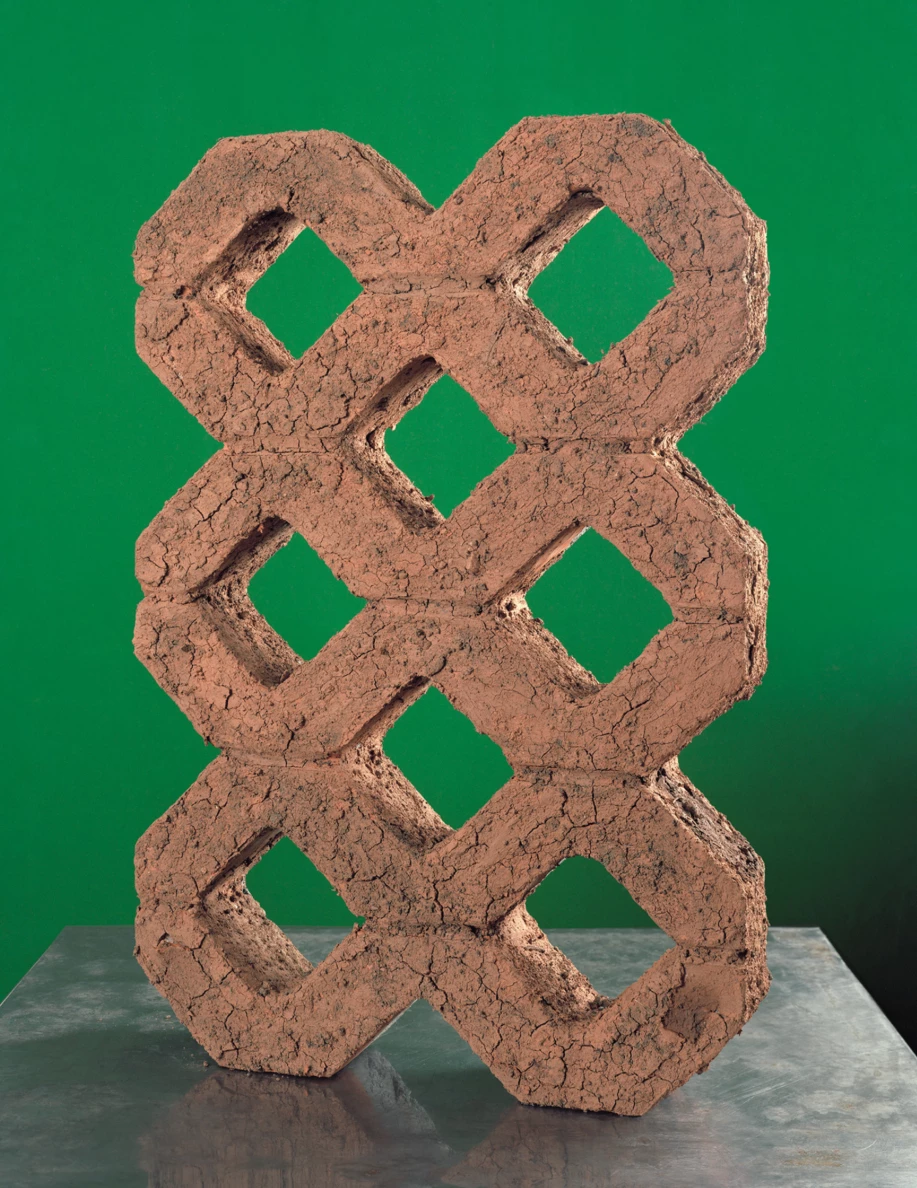 The three images are three identical bricks, the blue being a ready-made and the original, which morphs using techniques and materials borrowed both from the history of the hive and from vernacular architecture.