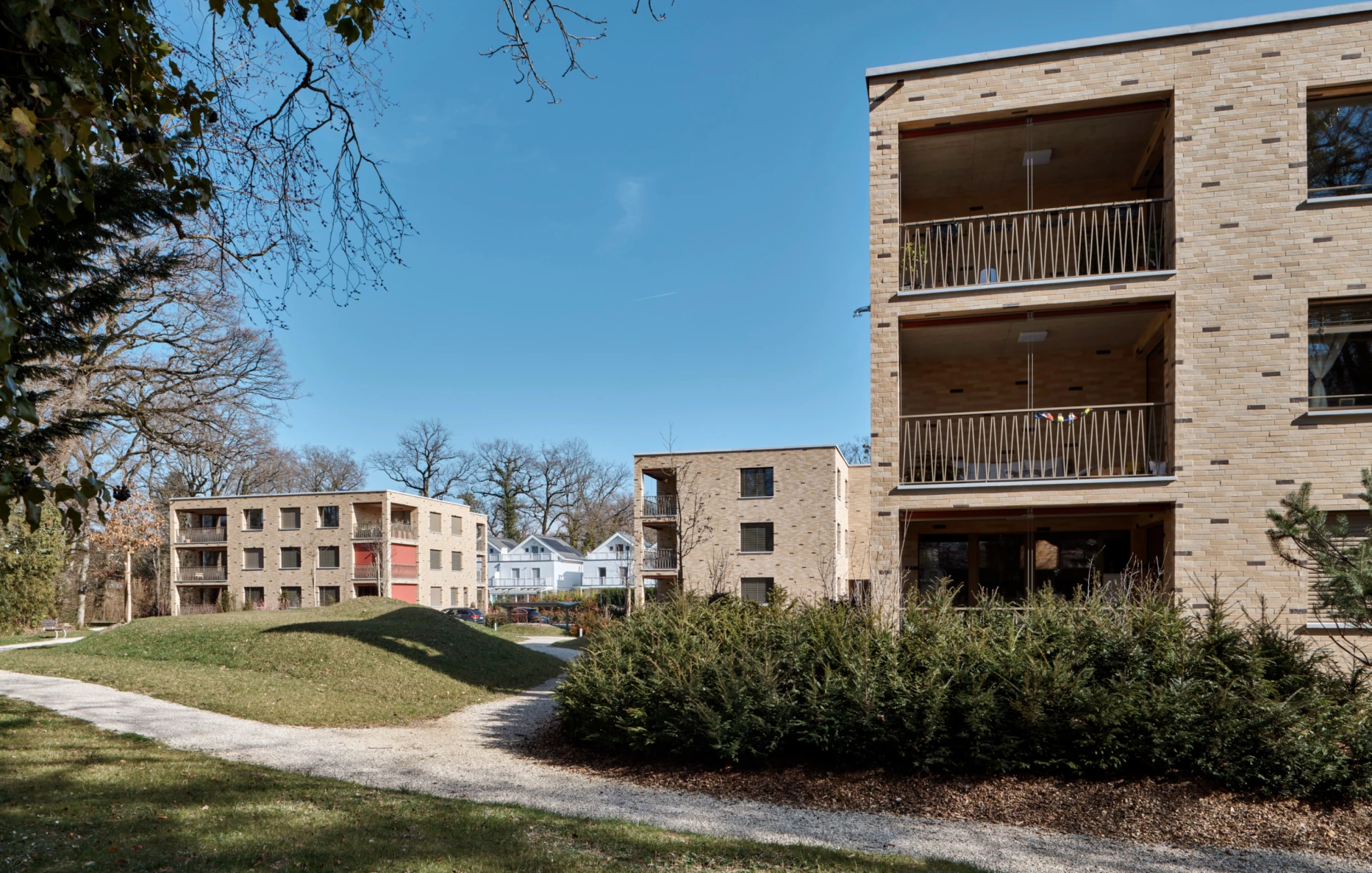 The owners of the land, direct descendants of the tile factory's founders, wish to enhance this attractive property - a decision that fully respects the place, its characteristics and its history. The distribution settled upon by the heirs creates three distinct buildings that form the autonomous pieces of a coherent and harmonious ensemble. Their compact size and volume match the scale of the neighboring constructions; the stretched parallelepipeds reveal unexpected perspectives and allow the different blocks to benefit from favorable positioning on the land. Around the heart of the complex, the project’s thirty-eight flats benefit from varied orientations, with beautiful living spaces extended by generously open loggias overlooking the view. Outside, the terrain remains accessible to neighbors, favors non-motorized traffic and creates a garden for communal use. This preserved natural setting represents an essential factor of the project and guarantees the local ecosystem’s balance. A highly developed ecological conscience can be seen in the selection of construction materials: reliable thermal insulation for a high energy performance, green roofs allowing for biological filtering and purification of rainwater, the creation of ground level parking to avoid extensive underground concreting. The aesthetic integration of the three structures is supported by the understated vocabulary of the facades, which elegantly balance empty and full spaces. Presenting a range of simple modules, the neat openings of the windows and the loggias play a meticulous score of alignments, parallels and repeating patterns. With the marked presence of bricks on the walls and the wooden windows and doors, the treatment of the facade draws from the site’s memory. A warm, noble materiality resonates like an homage to the brick manufacturing of times past, echoing the clay of the soil and harmonizing with the solemn presence of tall trees.