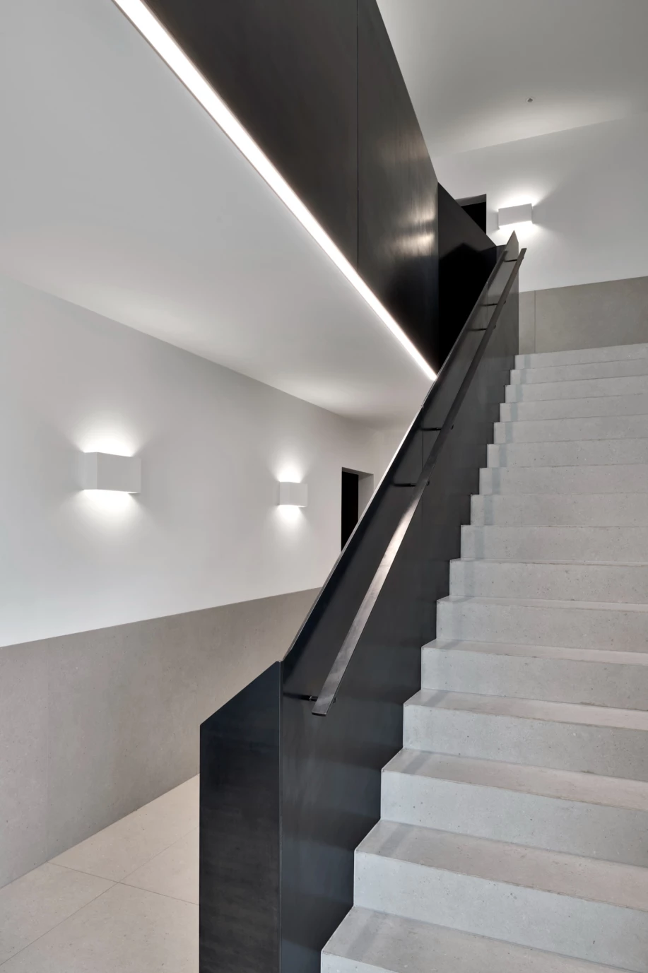 À l’extérieur en effet, le bâtiment assume des options chromatiques contrastées et un langage précis où les grands modules construits (murs, dalles) s’harmonisent avec les larges percements (fenêtres, loggias) dans un dessin exempt d’ornementation. Sans compromis, la clarté des lignes et l’expression presque austère des volumes témoignent de la maîtrise dans l’art de bâtir, allant jusqu’à invisibiliser les garde-corps et les systèmes d’obscurcissement, mais aussi les éléments techniques qui, trop souvent, viennent parasiter la lecture d’une architecture. Enfin, fidèle aux caractéristiques minérales des constructions environnantes, la texture microsablée du béton préfabriqué de l’enveloppe s’inscrit alors comme un hommage au site. Pensé à l’échelle du temps long, l’immeuble fait désormais pleinement partie du paysage.