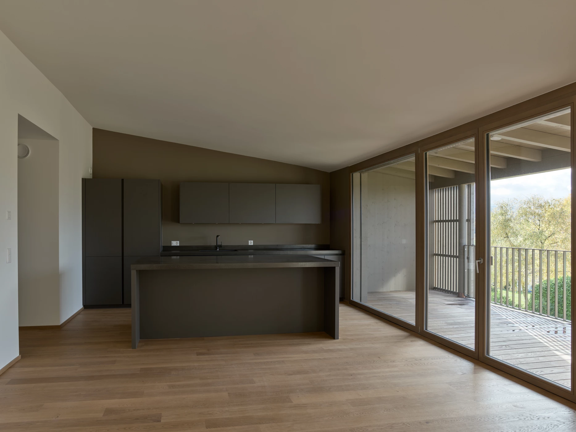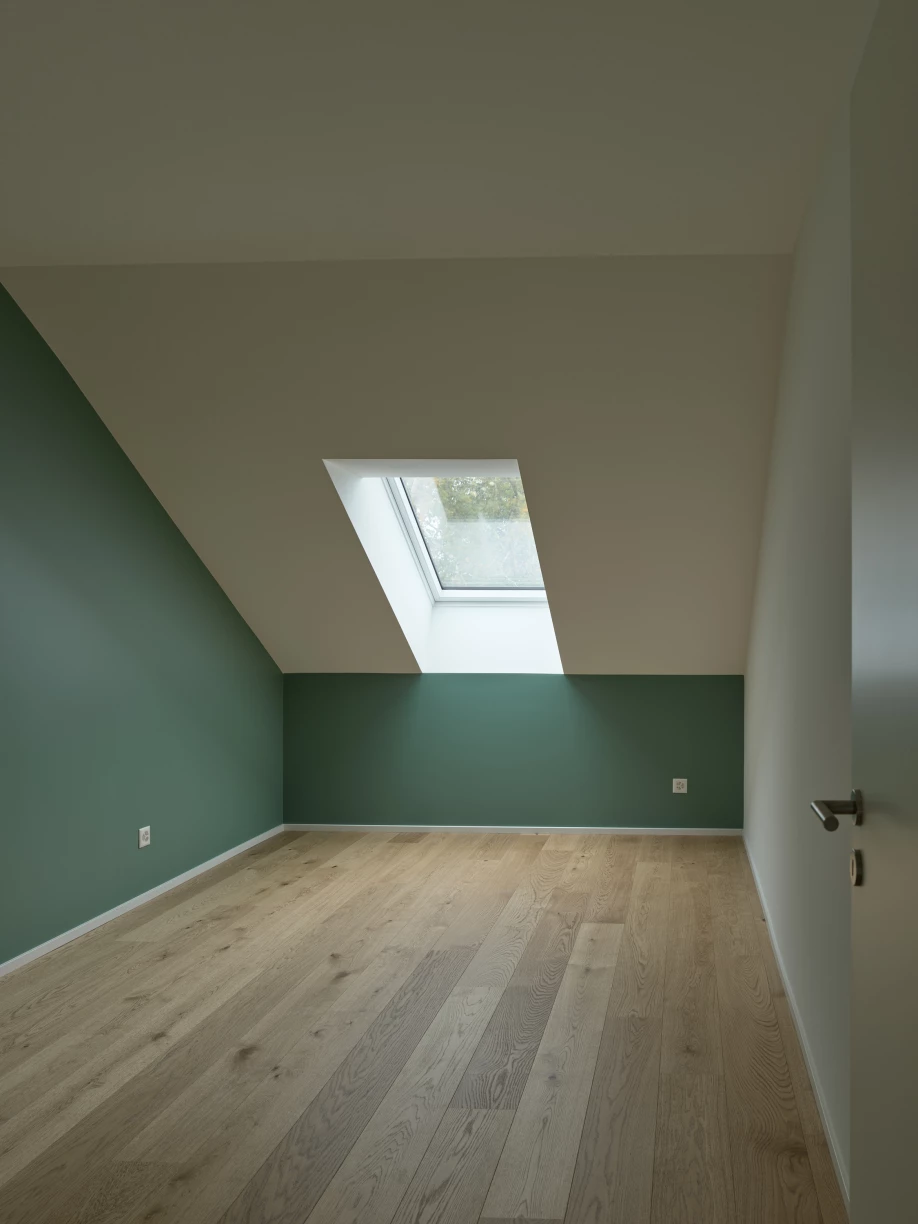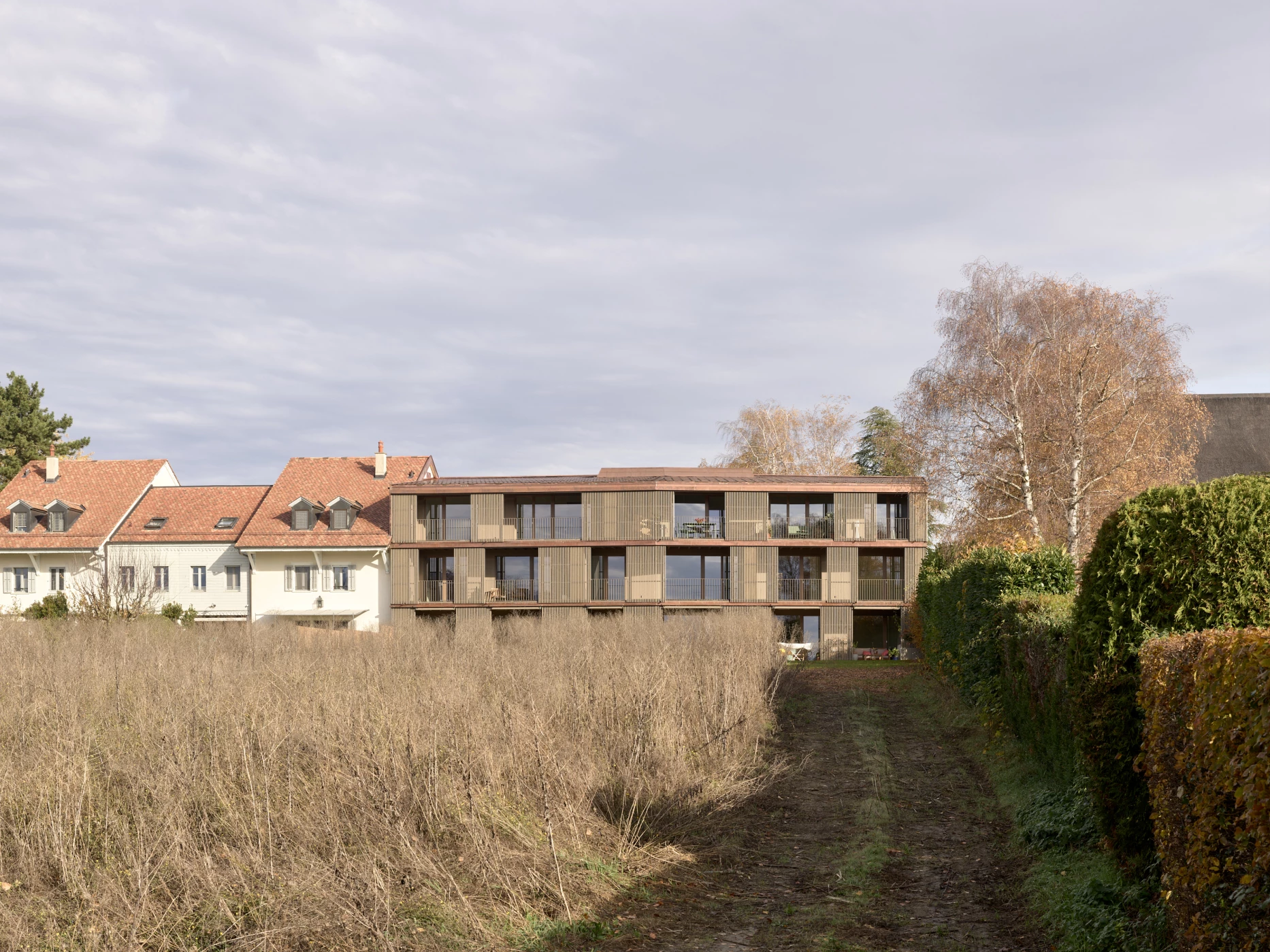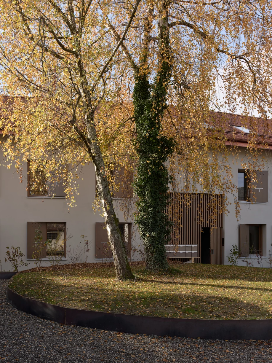 Remplaçant une banale villa isolée au centre de la parcelle, cet immeuble villageois entièrement dédié à l’habitation en PPE propose neuf appartements de 3, 4 et 5 pièces, ainsi qu’un parking souterrain. L’allure compacte du volume et le gabarit asymétrique de la toiture répondent à des options constructives écologiques pointues, mais également à une lecture sensible du site. La façade rue légèrement cassée reconduit les codes traditionnels dans un vocabulaire contemporain avec, notamment, un grand pan en tuiles naturelles et des ouvertures à un seul volet insérées dans une maçonnerie crépie à la chaux. Posés sur un sous-sol en béton recyclé, les murs extérieurs se composent de briques monolithiques de 50cm propices à une excellente masse thermique. Toutes les menuiseries sont bien entendu en bois et la cour ouverte revêtue d’un sol naturel perméable. Côté jardin, la façade très ouverte présente ses longs balcons filants sous une structure en bois parfaitement adaptée à l’orientation. Là, le toit peu incliné accueille en toute discrétion plus de 200m2 de capteurs solaires photovoltaïques qui, couplés à une pompe air-eau pour la production et le stockage de chaleur, comblent l’ensemble des besoins du bâtiment à l’année.